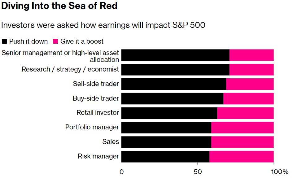 投资者预计,三季度财报季将进一步打压美国股市,并特别关注苹果公司(AAPL.US),将其作为全球经济状况的风向标。MLIV Pulse最新调查的724名受访者中,超过60%的人表示,财报季将推低标普500指数。这意味着股市的低迷走势还没有结束的迹象。上周五的暴跌彻底粉碎了人们的希望,即上周早些时候令人瞠目结舌的两天涨势后将是更大涨势的开始。约一半的受访者还预计,股票估值将进一步低于过去10年的平均水平。