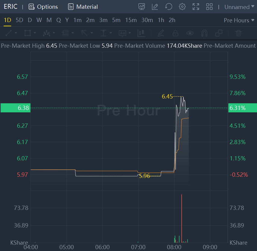 The U.S.-listed shares of Ericsson (ERIC-B.SK) surged 6.3% toward a one-month high in premarket trading Thursday, after the Sweden-based communications services company said it will record a SEK2.3 billion ($220 million) charge for a potential resolution with the U.S. Department of Justice regarding alleged breaches under its 2019 Deferred Prosecution Agreement $(DPA.UK)$.