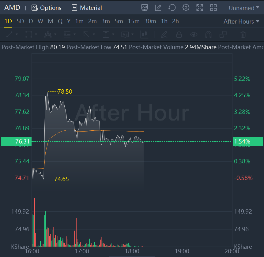 AMD shares $(AMD)$ rose 1.5% after hours, following a 3.7% gain in the regular session to close at $75.15.