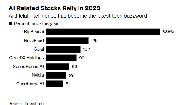 这也不足为其。渴望人工智能的投资者推动AI芯片领军者英伟达(NVDA.US)一跃成为今年大盘股中表现最好的股票,该公司为复杂的人工智能计算任务制造所需的最底层技术――GPU芯片。名称中带有AI的一些相对默默无闻的公司也迅速崛起,比如BigBear. ai Holdings(BBAI.US)年内涨幅超过280%,而 C3.ai(AI.US) 和 BuzzFeed(BZFD.US)涨幅均超过一倍。Guardforce AI(gfai.us)股价上涨约50%。