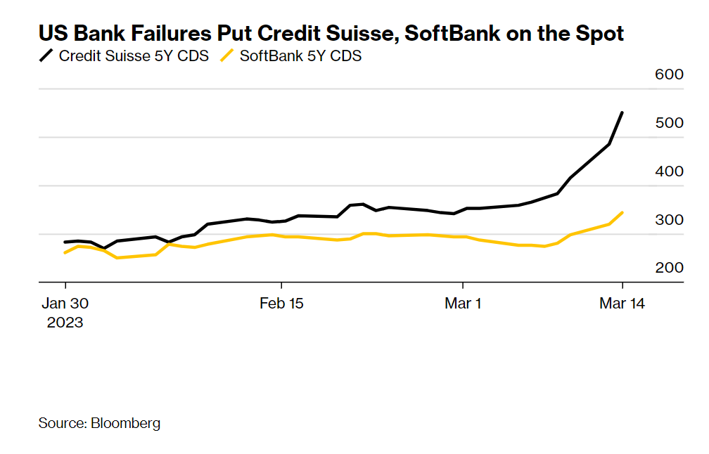 硅谷银行倒闭的冲击波正波及全球金融机构,投资者纷纷抛售被视为风险更高的银行和贷款机构。瑞信也没能幸免,其股票和债券是周一美国以外表现最差的股票和债券之一。这家瑞士银行的资产负债表风险不像SVB那样高,但其信用违约掉期(CDS)的价格却大幅上涨。
