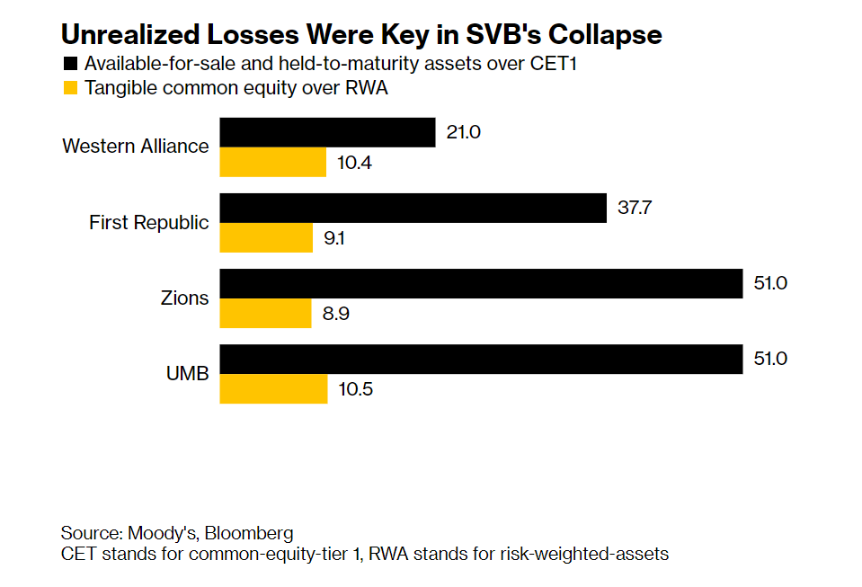 如果出现高于预期的提款情况,包括第一共和国银行、西方联盟、Zions、UMB、Comerica和盈方在内的6大银行将需要在亏损的情况下清算其投资组合。这反过来又会对其盈利能力和资本缓冲造成压力,它们的盈利能力和资本缓冲往往低于同行。