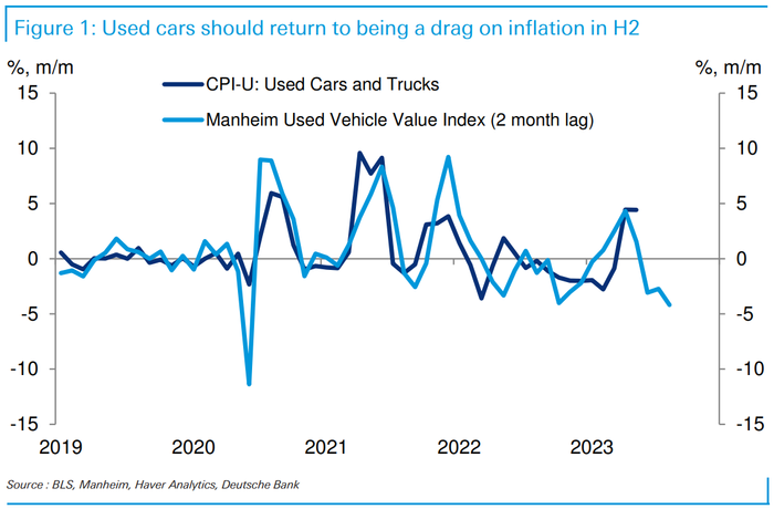 Deutsche Bank's Jim Reid shared a chart illustrating the relationship between the Manheim Index and the used cars and trucks component of CPI, showing that the latter closely tracks the former.