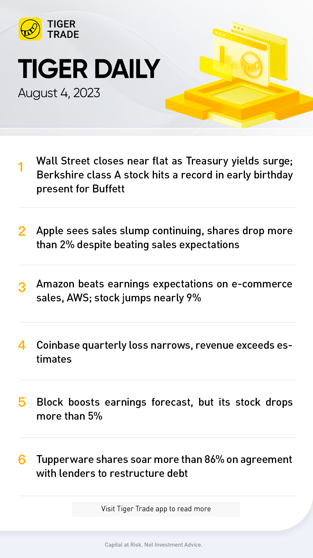 The benchmark U.S. 10-year Treasury yield rose as high as 4.198% during the session, the highest since November, extending its climb from a day earlier following Fitch's downgrade of the top-tier U.S. credit rating. In late afternoon trade, the 10-year yield had dipped below 4.194.