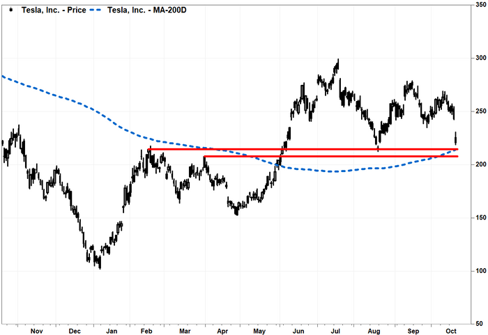 But with the electric vehicle giant's stock $(TSLA)$ already suffering its biggest two-day drop in two years following a disappointing earnings report, it has approached an important chart zone with multiple support points, that should at the very least slow the slide, if not stop it.
