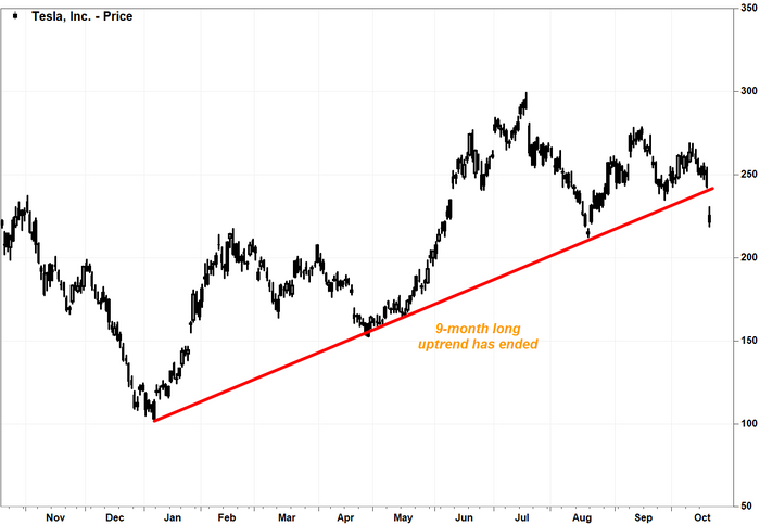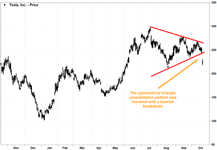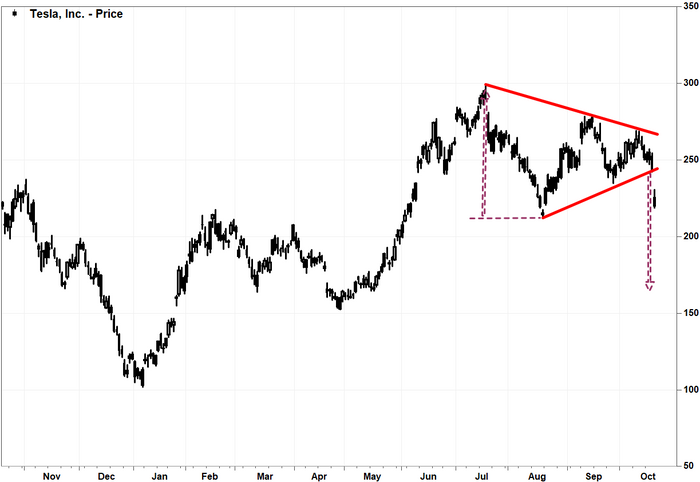 Tesla Inc.'s stock has sliced through the bottom of a "triangle" consolidation chart pattern, and investors are worried about further weakness.