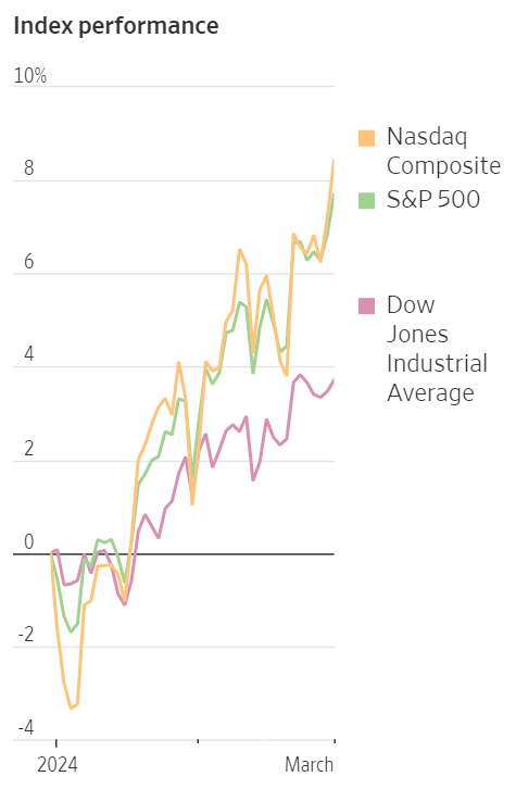 Bets that the economy has staved off a recession and the Fed will soon pivot to cutting rates are fueling the euphoria. The S&P 500 has climbed 7.7% to start 2024 and has notched 15 closing records in the process. Nvidia shares have led the way, up 66% after more than tripling last year.