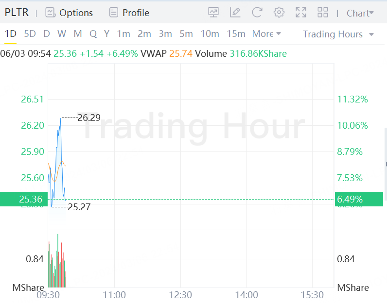 Palantir shares were rising 6% in morning trading Wednesday to $25.36.