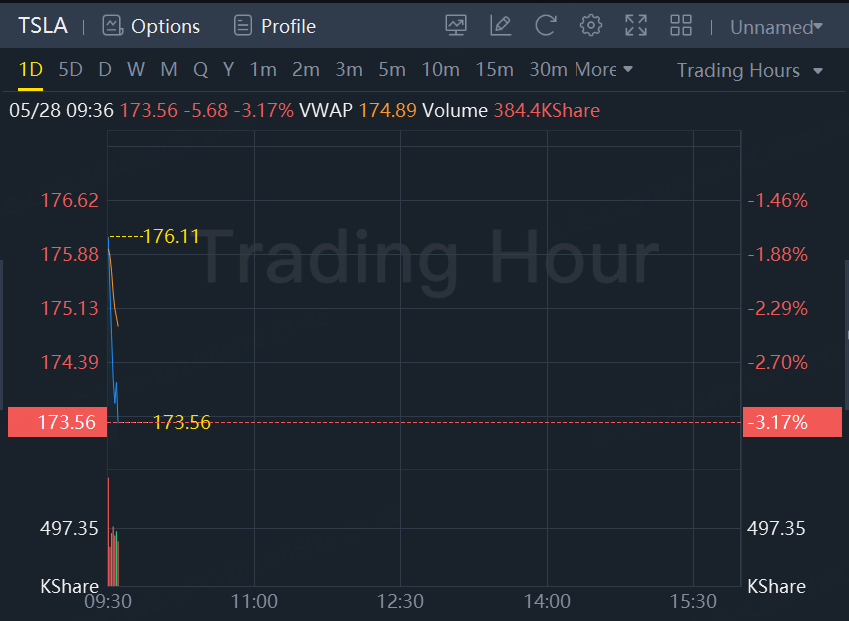 Tesla stock is down 3.2% to $173.56 in morning trading Tuesday.