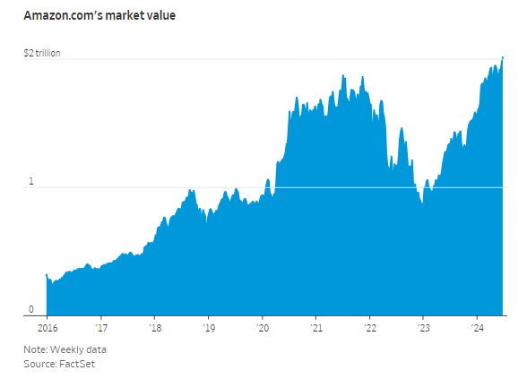 That heavy investment contributed to Amazon this past week becoming the fifth-ever U.S. company to reach the milestone of $2 trillion in market value. The stock closed Friday at $193.25, valuing the company at $2.011 trillion.