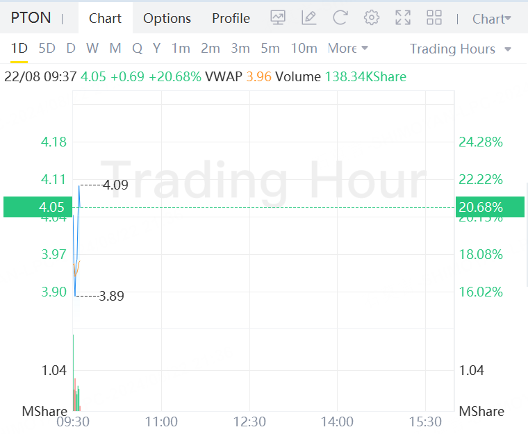 Peloton stock soars 20.68% in morning trading.