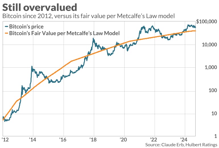 The distinction between being "right" and being "useful" is also helpful when judging my column six months ago, the last time I last wrote about bitcoin's valuation. At the time, the cryptocurrency had just hit a record high above $70,000, double the $35,000 price that the model at that time calculated it to be worth. Bitcoin today is more than $10,000 lower, and 24% below its record high.