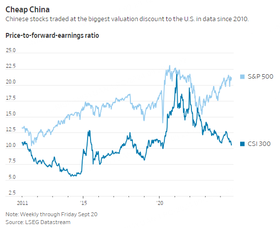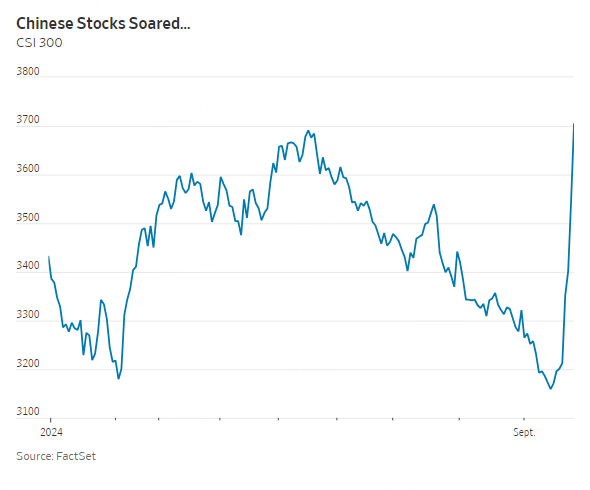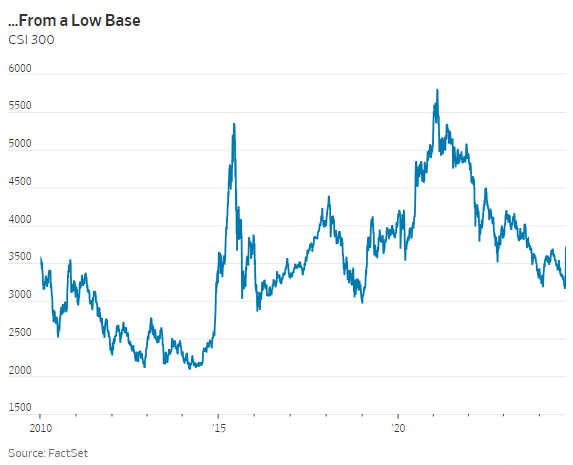 Such cheapness helps explain why the new policy and politburo comments led to such an extraordinary gain, with the CSI 300 index of the largest companies up 15.7% in the week. After all, even the most bullish economists don't expect support on the scale of November 2008 -- when the weekly gain was 15.8%.
