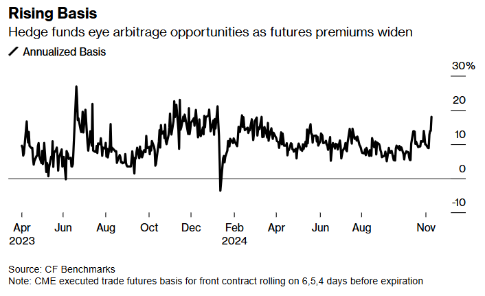 自上周特朗普赢得美国总统大选以来,比特币价格飙升了约30%,续创新高。这使得比特币期货与这种数字货币价格之间的价差达到了3月份以来的最高水平,当时美国现货比特币ETF上市,推动比特币飙升至纪录水平。