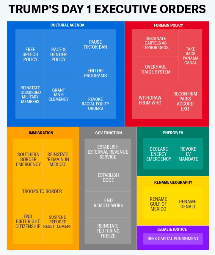 Empowering Musk's DOGE: The president signed an executive order creating the Elon Musk-led Department of Government Efficiency. He also enacted orders to f reeze federal civilian hiring and to require workers within the executive branch to return to in-person work.