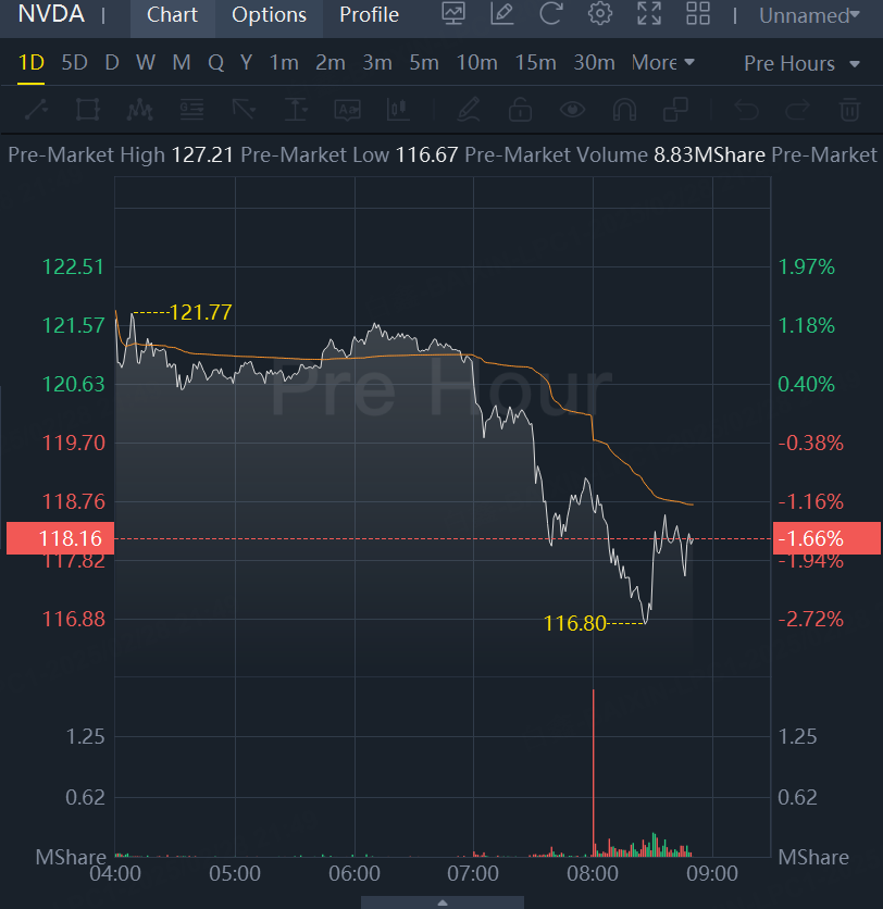 Nvidia stock fell 1.7% to $118 in premarket trading Friday while futures tracking the Nasdaq 100 were flat.