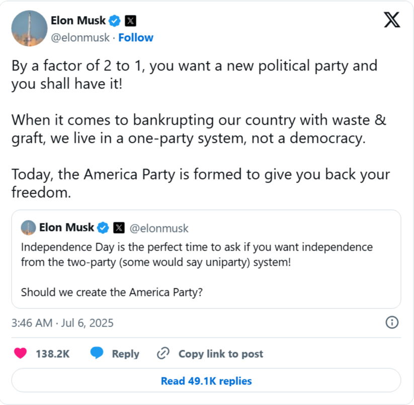 On Saturday, Musk announced he was forming the "America Party," after running a poll on X asking if a new political party should be created. Musk has more than 225 million followers on X, and the poll garnered almost 79 million votes, with 65.4% saying "Yes" to a new party.