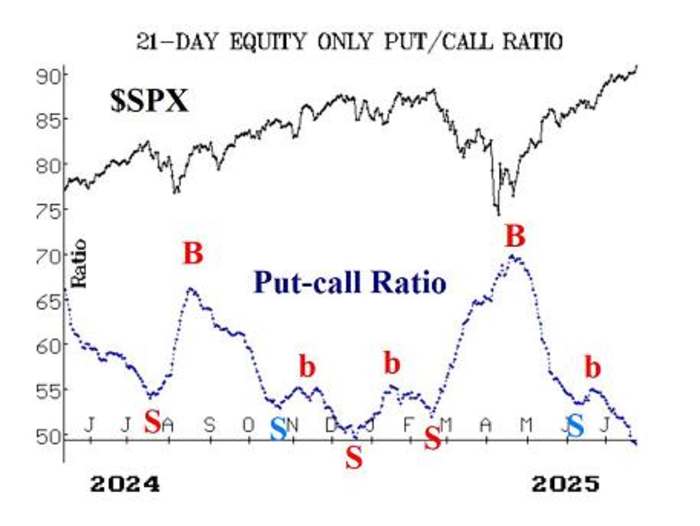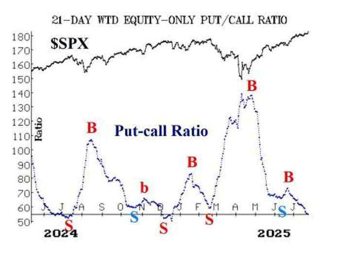 Equity-only put-call ratios continue to decline. The standard ratio has fallen below last year's lows and is now at the lowest levels since November 2021. Even so, that is merely an overbought condition and not a sell signal. Similarly, the weighted ratio has fallen to new 2025 lows, but it has not yet exceeded the lows of 2024. It, too, is in overbought territory. However, these ratios will not give confirmed sell signals until they roll over and begin to trend higher.