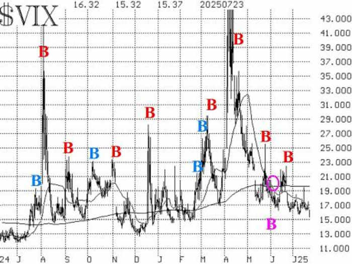 Long 1 SPY (Aug. 1) 630 call and short 1 SPY (Aug. 1) 650 call: This is the "spike peak" buy signal of June 24. SPY traded at 630 on July 21, so the spread was rolled up, per the standing instructions above. Even though the 22-day holding period for the "spike peak" buy signal trading system has been reached (as of today), we are going to retain a position with a tightened stop: Sell the spread and buy the SPY (Aug. 22) 635 call outright long. Stop out if VIX closes above 18.37.