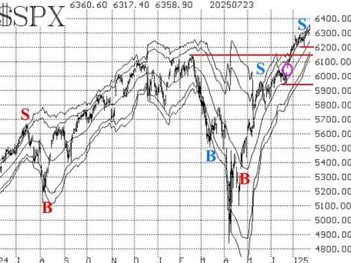 The S&P 500 Index SPX continues to plow ahead to one all-time high after another. The SPX chart remains bullish, and even though there are overbought conditions, we are not seeing confirmed sell signals yet. There is support at 6,200 (last week's lows), at 6,150 (the previous highs) and then in the 6,020-6,060 area (gap on the SPX chart), and finally at 5,920. All of these are marked on the SPX chart below. The chart is bullish as long as SPX remains above 5,920.