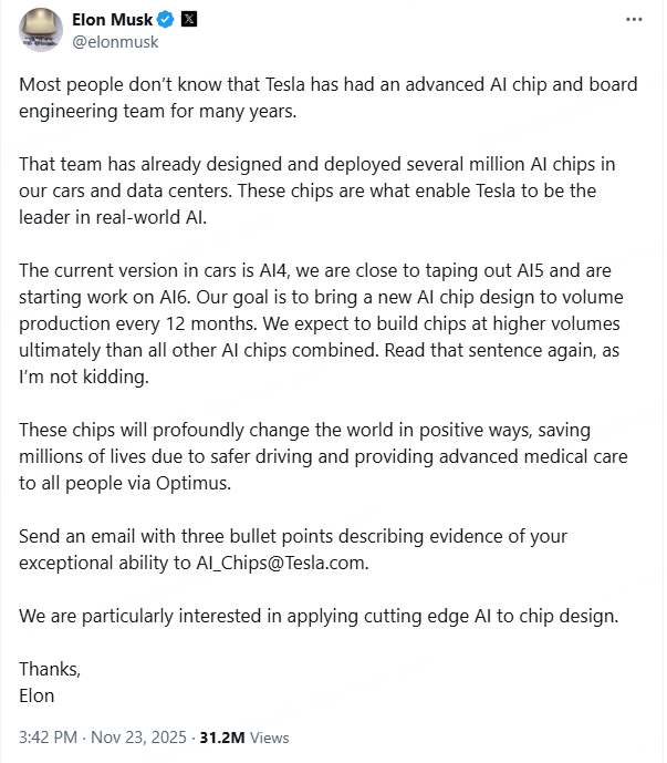 "These chips will profoundly change the world in positive ways, saving millions of lives due to safer driving and providing advanced medical care to all people via Optimus," added Musk, while putting in a plug to recruit more AI talent to his company. "Send an email with three bullet points describing evidence of your exceptional ability to AI_Chips@Tesla.com."