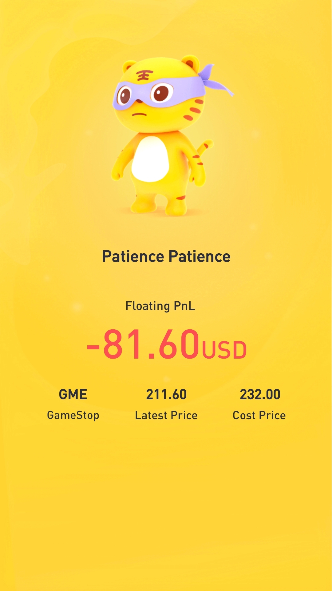 $GameStop(GME)$If you're getting emotional over little 10-20 dollar spikes and dips, chill and relax, you'll paperhand at this rate. Read the dd, do some research, understand why you're holding the stock. Has the dd changed? No? Then don't worry. This stock is super volatile and prices will jump wildily. But this does not mean it's risky! Zoom out and you will see that the floor is steadily rising over time. Already read the dd? Take a break and stop looking at the ticker, maybe get some work done. You're not gonna miss the MOASS if you look away for 1 day. Like the tiger is saying, PATIENCE. Change takes a long time.