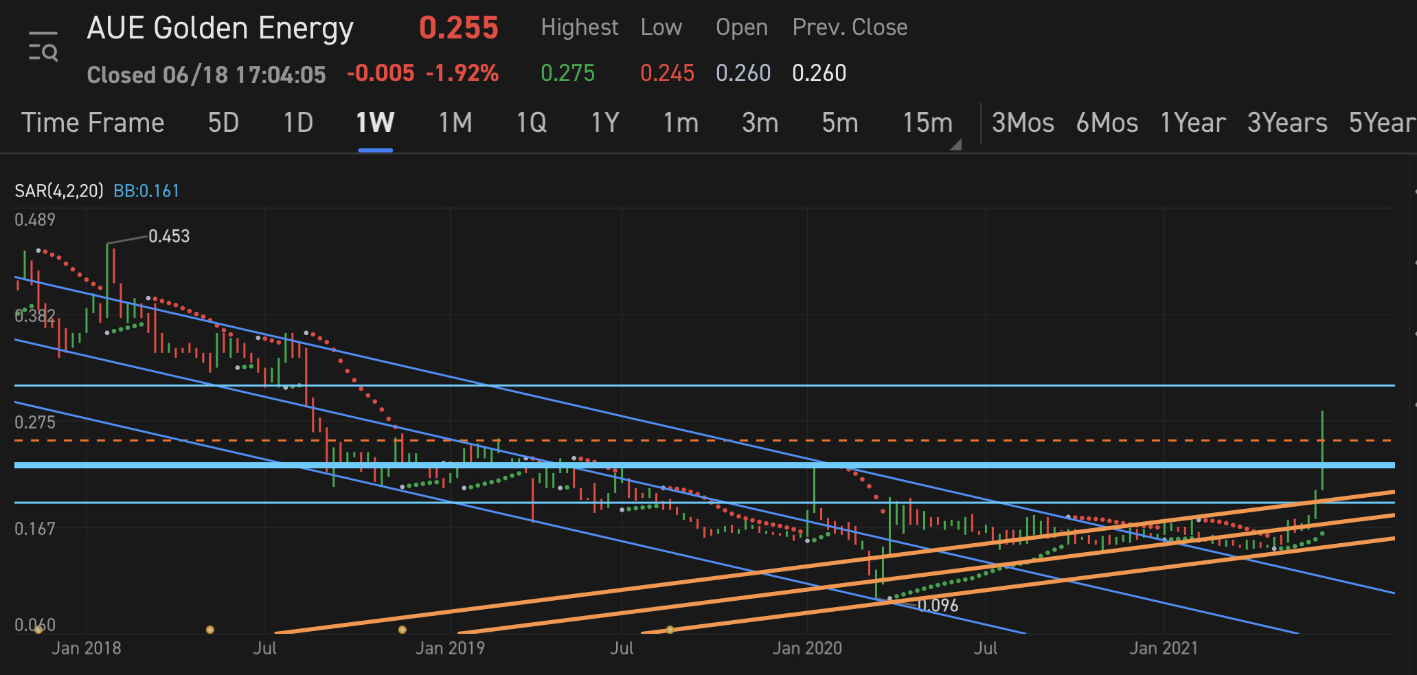 $GOLDEN ENERGY AND RESOURCESLTD(AUE.SI)$Strong conviction of multi years push, retesting resistance and out of cloud. Wait for upcomingdividend possibility