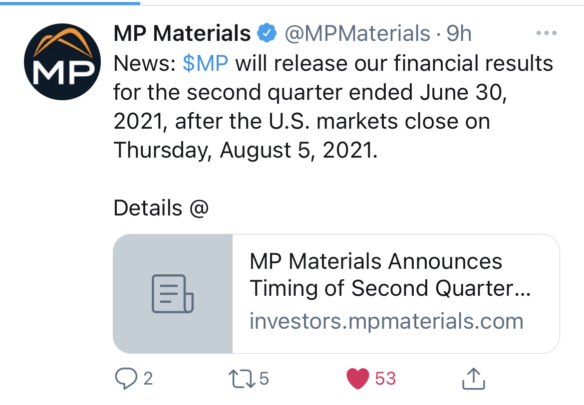 $MP Materials Corp.(MP)$Hopefully the earnings will give prices a boost [Miser] [Miser] [Miser]