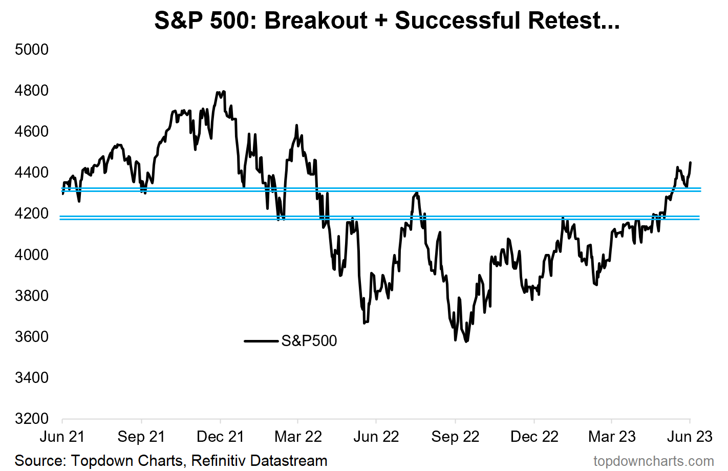 Another month, another move higher — the S&P500 up +6.5% on the month (the 4th monthly gain in a row), +15.9% YTD, and +24.4% off the October low, and now 6-months in a row closing above its 10-month moving average. There’s still 7.8% to go to the upside until it matches the all-time high from the turn of the year in 2022. But very clearly a solid run already.