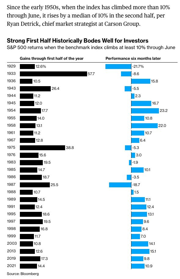 Here’s the historical perspective on how markets have traded in the second half of the year following a 10%+ gain in H1. Hint: it’s mostly positive, albeit with numerous exceptions, and a couple of particularly notorious exceptions!