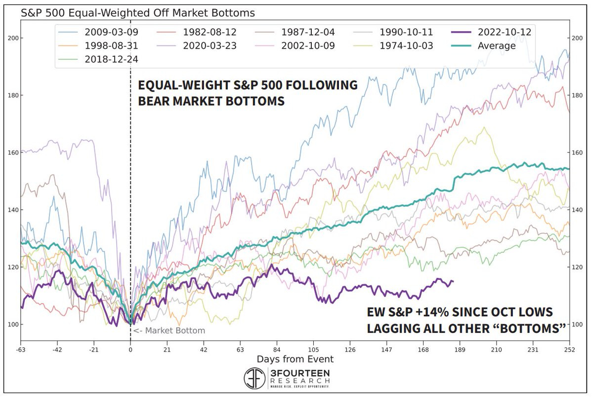 So if we take October 2022 as the low, while the headline market cap weighted S&P500 has done decent (+24%) the equal-weighted version has way undershot (+17%) (and Nasdaq way overshot (+41%), more on that in a minute), but it’s also undershot vs previous and typical bear market recoveries. Bull market for some, bore market for others.