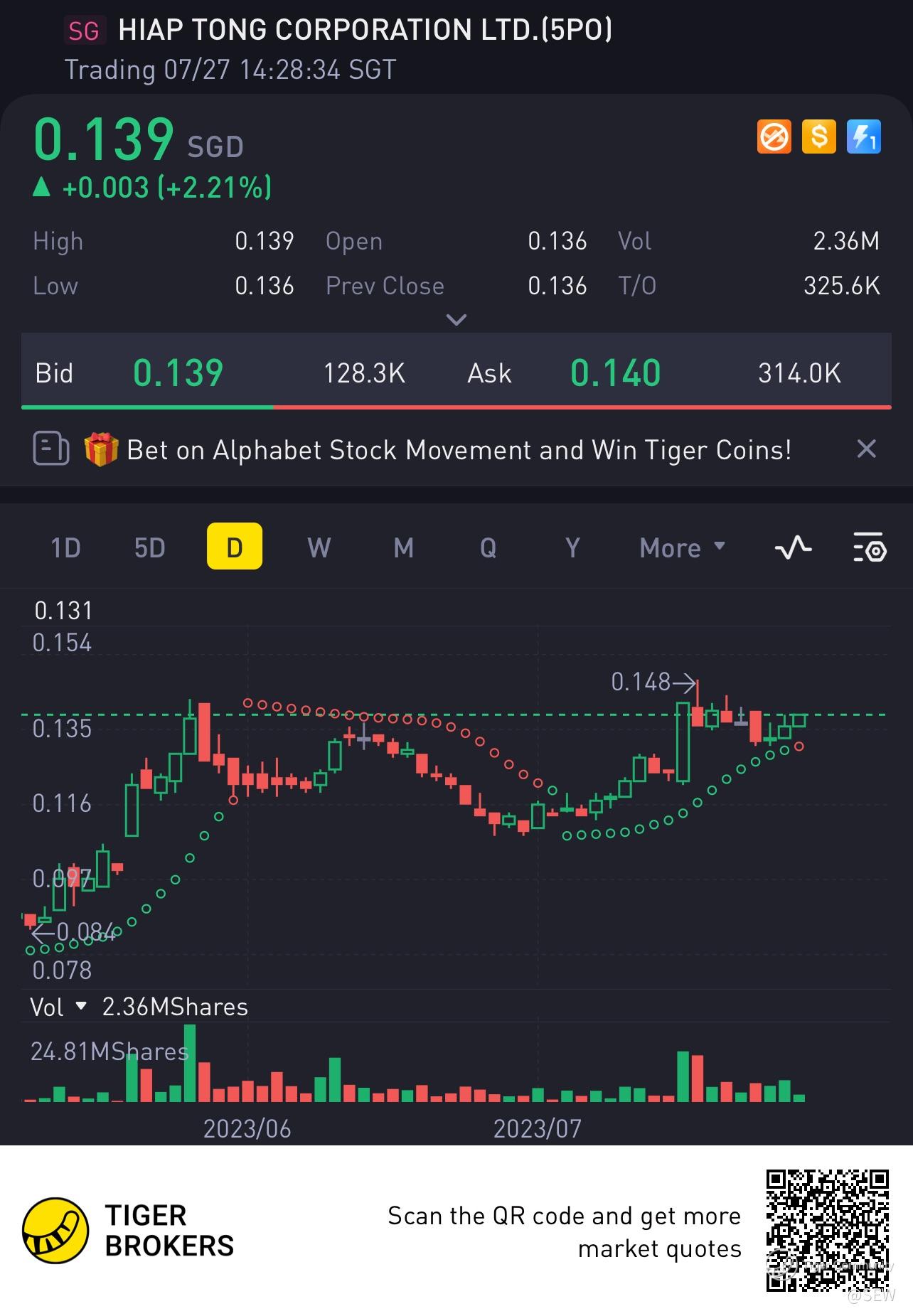 $HIAP TONG CORPORATION LTD.(5PO.SI)$ Cup and handle chart? Go break out 142!