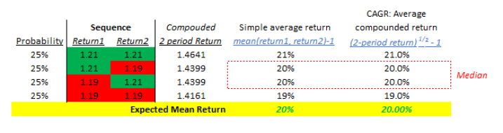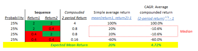 An investment that is equally likely to return 60% as it is to lose 20% has a 20% expected return but if you keep re-investing your long-term median outcome is closer to a 12–13% CAGR.