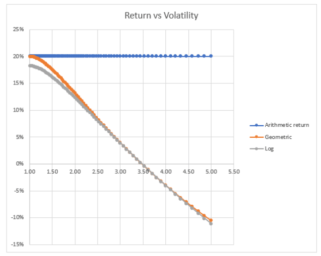 - Compounded and log returns are better measures for what you expect to find in your bank account after volatility has taken its toll. Remember if you lose 50% on an investment you need 100% to get back to even. If you earn 50% on an investment you only need to lose 33% to be back at even.