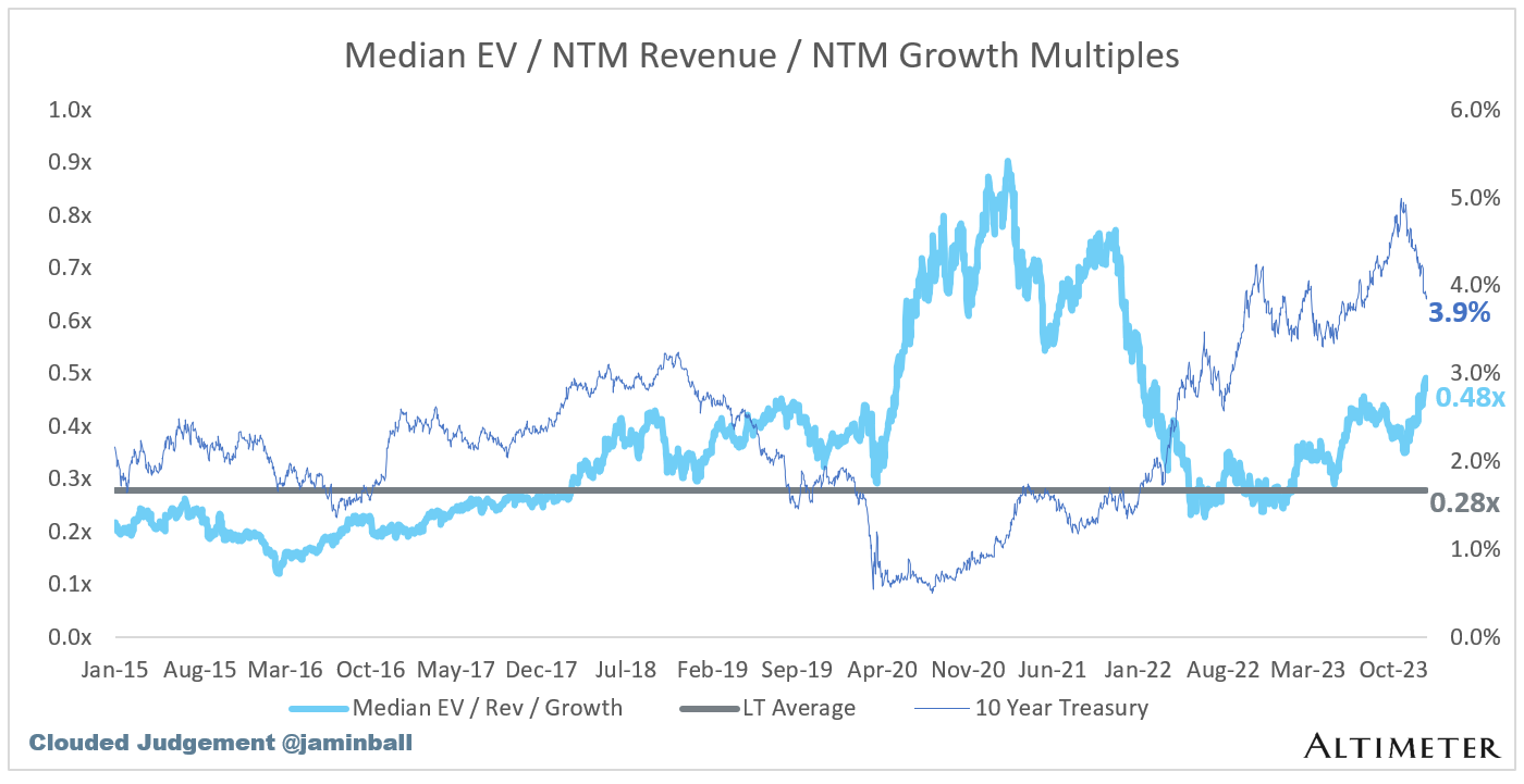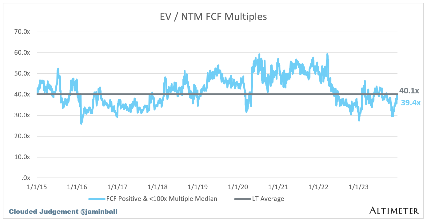 The piece left out of the analysis is interest rates, which are obviously higher today than the period of 2010 to 2020. So given where rates are, all else being equal, you’d expect multiples to be below the long term average. On a FCF basis, the median FCF multiple today is 39x, while the long term average is 40x. So on a FCF basis, multiples today are about where they’ve been over the long term.