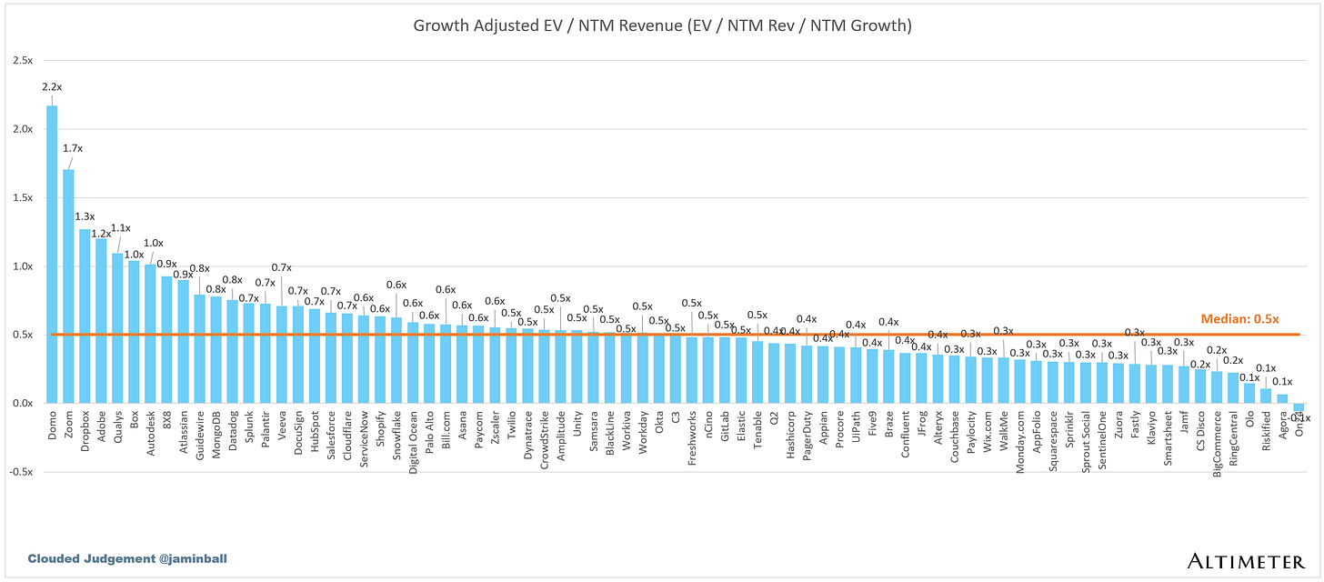 The below chart shows the EV / NTM revenue multiple divided by NTM consensus growth expectations. So a company trading at 20x NTM revenue that is projected to grow 100% would be trading at 0.2x. The goal of this graph is to show how relatively cheap / expensive each stock is relative to their growth expectations