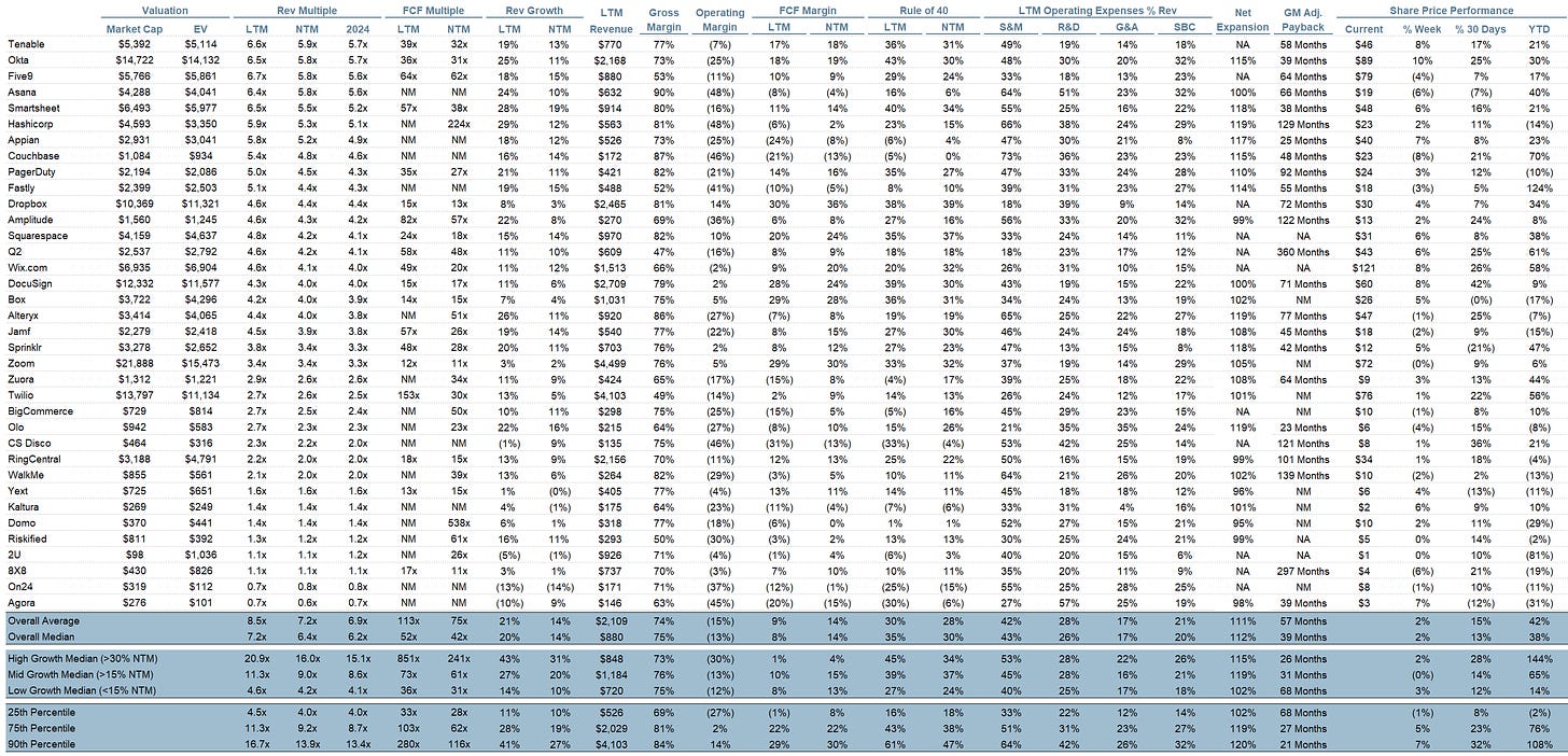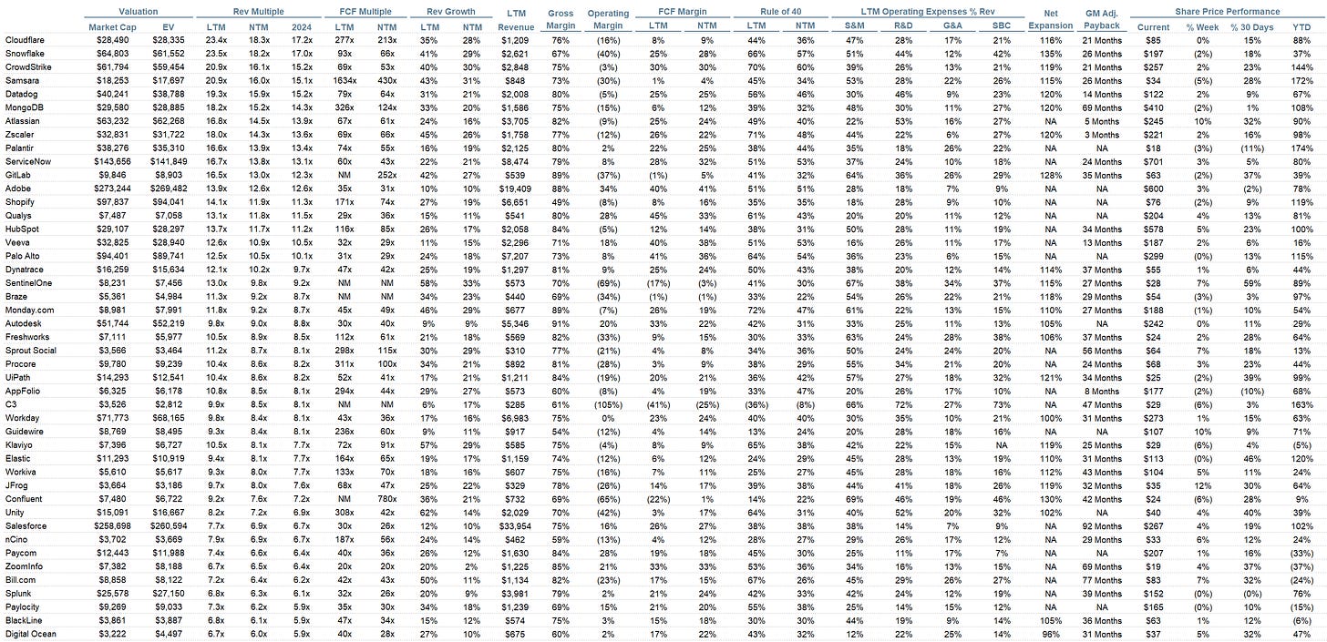 Rule of 40 shows rev growth + FCF margin (both LTM and NTM for growth + margins). FCF calculated as Cash Flow from Operations - Capital Expenditures