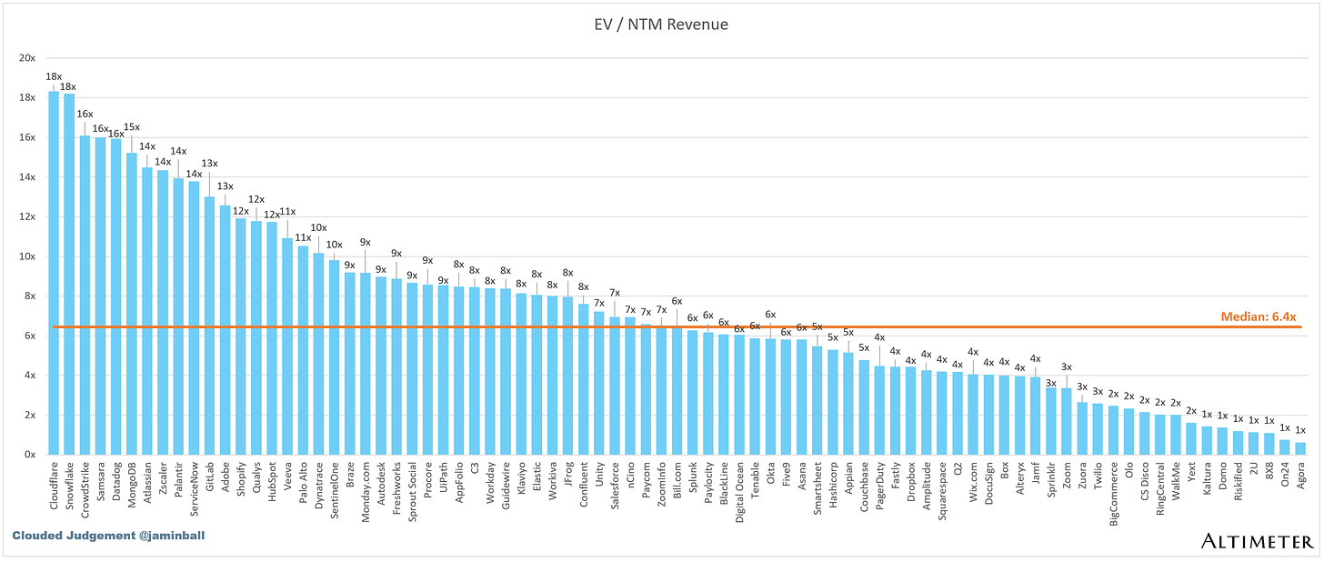 SaaS businesses are generally valued on a multiple of their revenue - in most cases the projected revenue for the next 12 months. Revenue multiples are a shorthand valuation framework. Given most software companies are not profitable, or not generating meaningful FCF, it’s the only metric to compare the entire industry against. Even a DCF is riddled with long term assumptions. The promise of SaaS is that growth in the early years leads to profits in the mature years. Multiples shown below are calculated by taking the Enterprise Value (market cap + debt - cash) / NTM revenue.