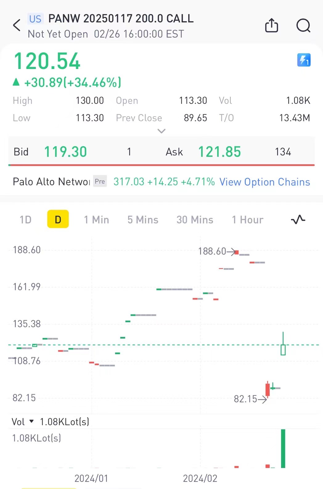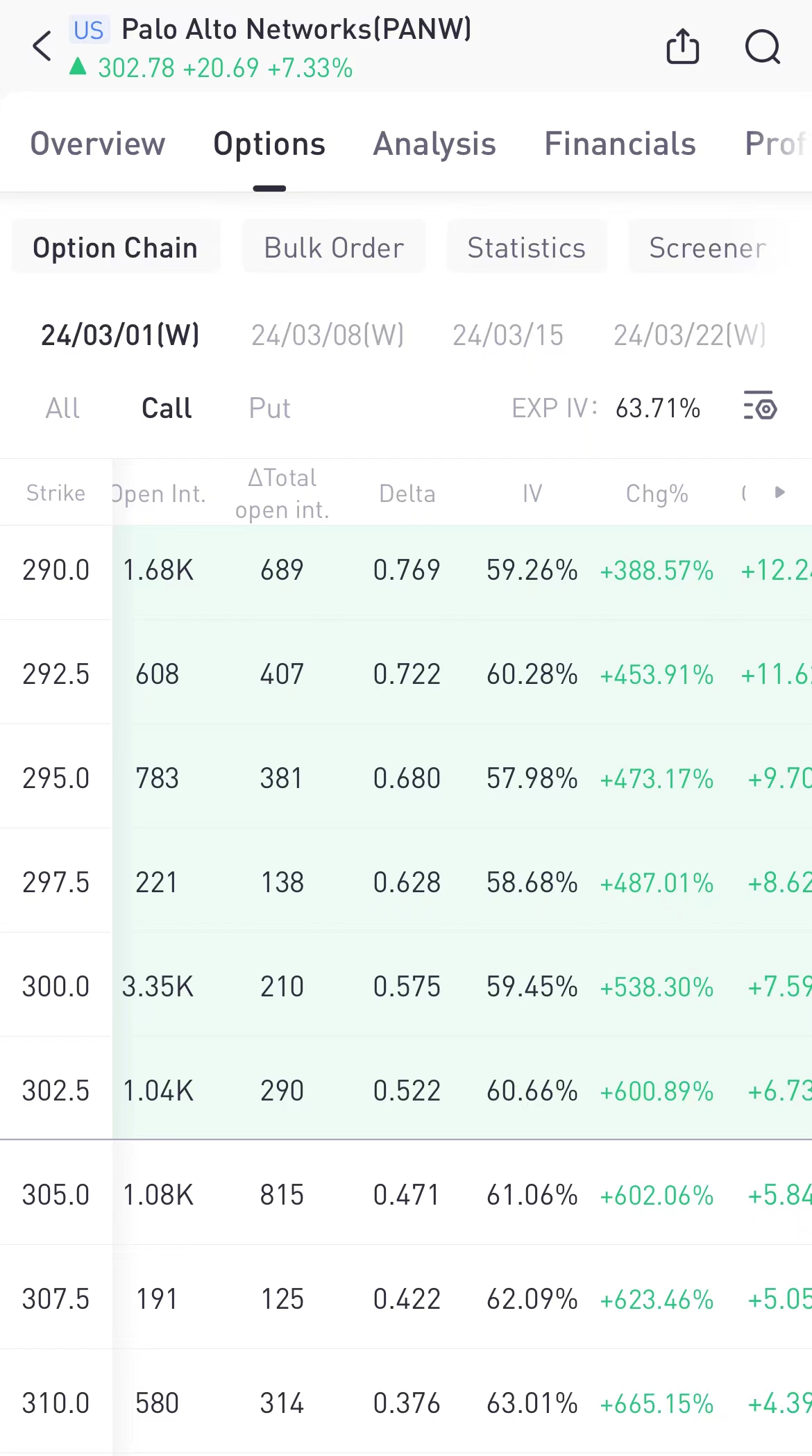 Palo Alto’s option chain shows that several call options such as $302.5, $305, $307.5 strikes expiring this Friday skyrocket over 600% on Monday.