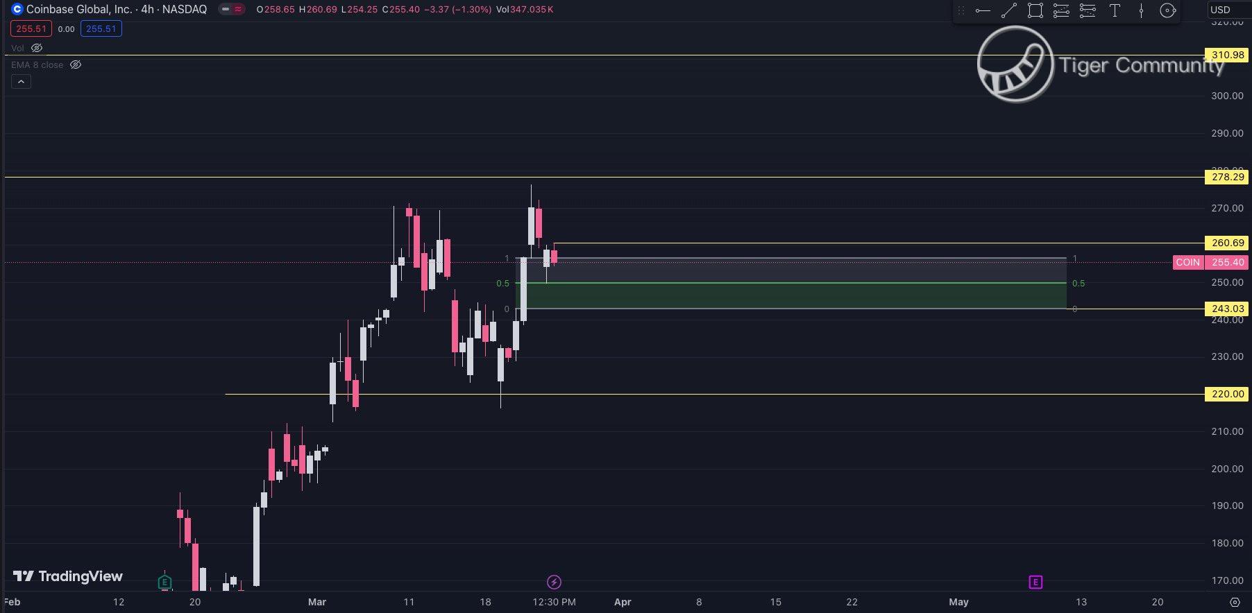 coin is looking like an A+ setup - 4HR formed a bullish FVG - BTC halving is in less than a month - Base meme coins are gaining attention Balls deeps in CALLS if price enters our discount/ green zone