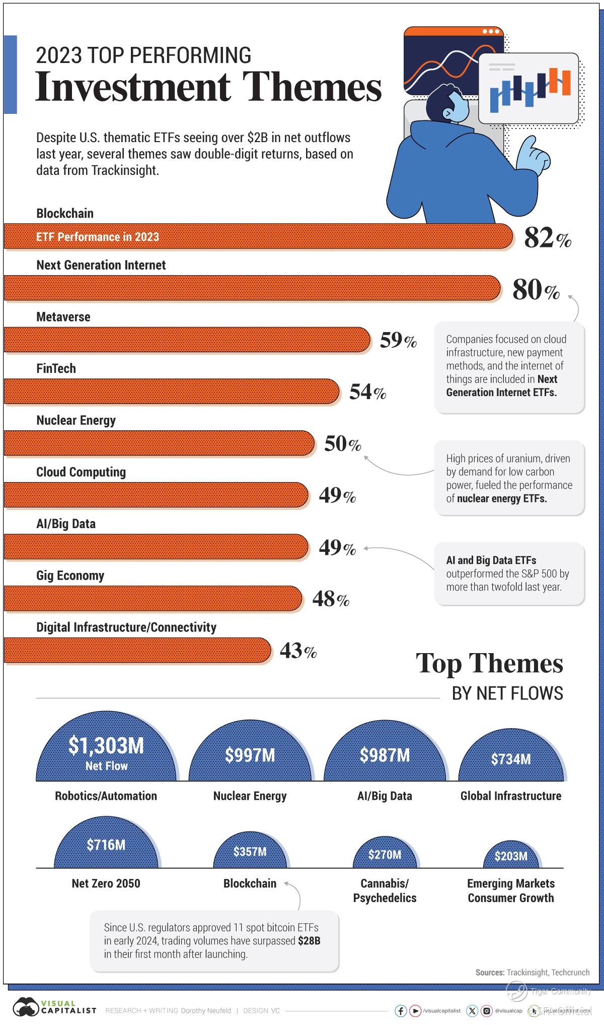 In 2023, investment themes like Blockchain, Next Generation Internet, and AI/Big Data outperformed the S&P 500’s 24% rebound.