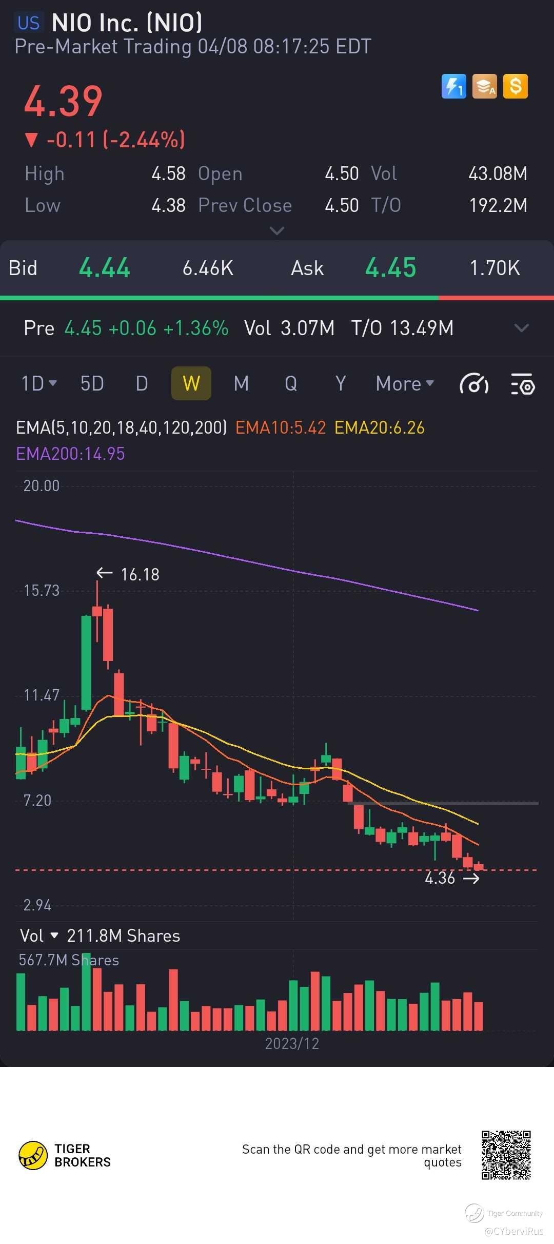 $NIO Inc.(NIO)$ share price broke lower in last week trading session. Nio has been trading above EMAs, which is a sign of weekness. The lower closed enhances the weakness.