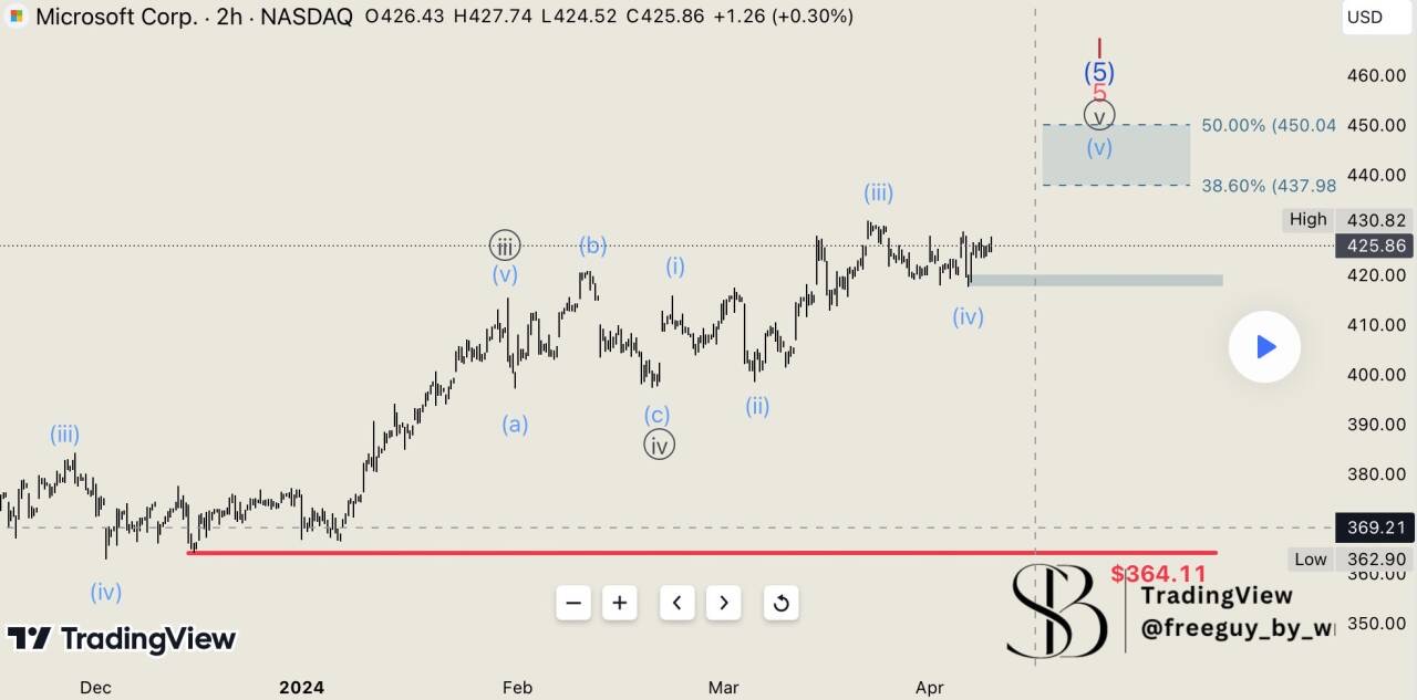 For Microsoft $Microsoft(MSFT)$ , we've recently observed an uptick and, for visualisation, activated the 100% level on the two-day chart as a maximum target. A closer look on the two-hour chart suggests that we might be in the final wave, Wave 5. Since developing Waves ((iii)) and ((iv)), we've formed four more waves and are now approaching a new all-time high. We consider a maximum of $450 to be realistic, though further increases are possible. After such a substantial rise, we expect the target range to be between 38.6% and 54%, around $450. This area could be intriguing to monitor for a potential trend reversal. If such a reversal occurs around $450, we would look out for possible short positions. However, should we significantly surpass this level, which we currently don't anticipate, we would seek long positions. Depending on these developments, we'll adjust our strategy accordingly.