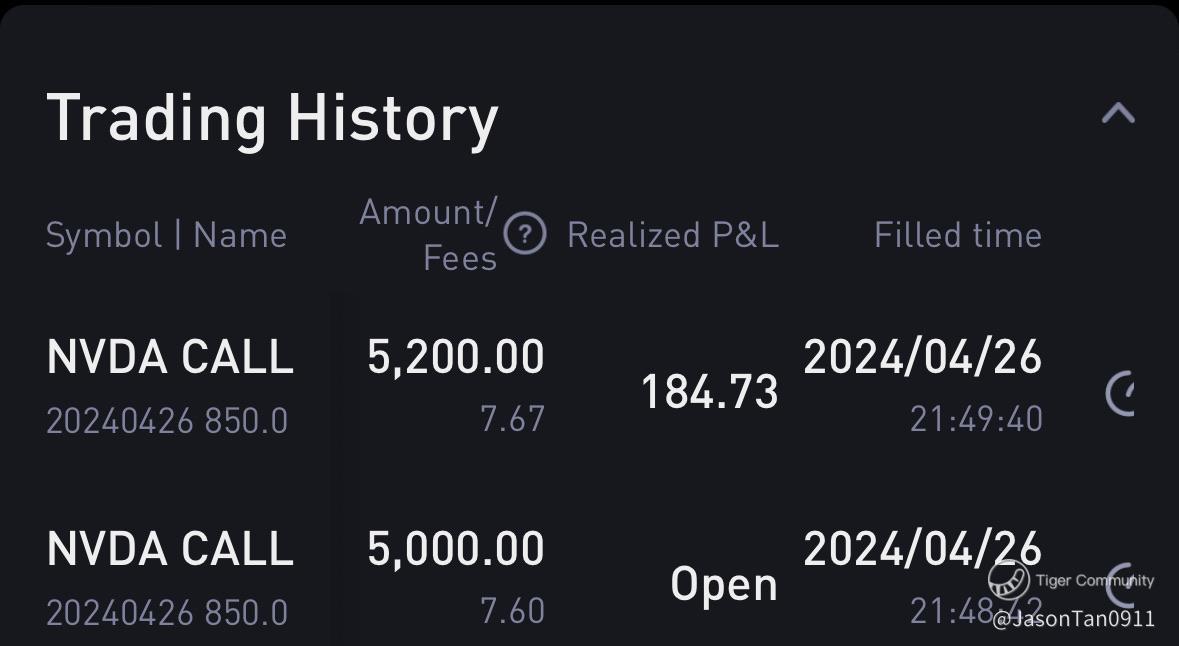 $NVDA 20240426 850.0 CALL$ Take small profit day by day it's the plan now...I have chance to make it back all my loss in this one option trade but was to panic to sell off because you can't predict what will happen...I do know everytime I hold it I will get burned. I guess I don't have any luck to earn big money in one shot.