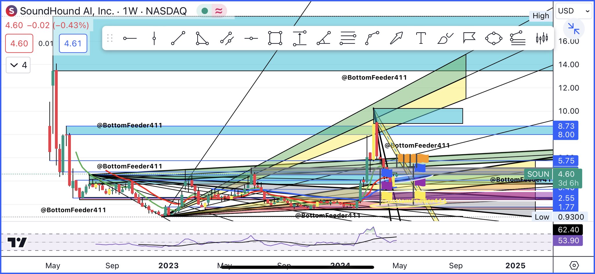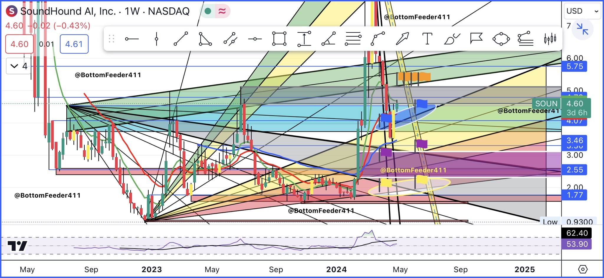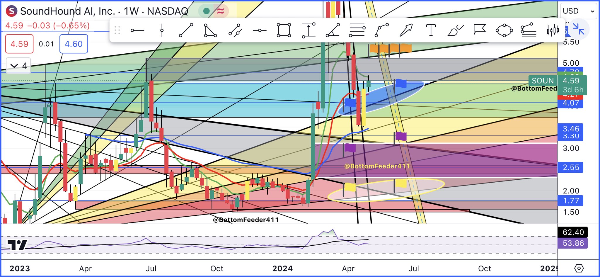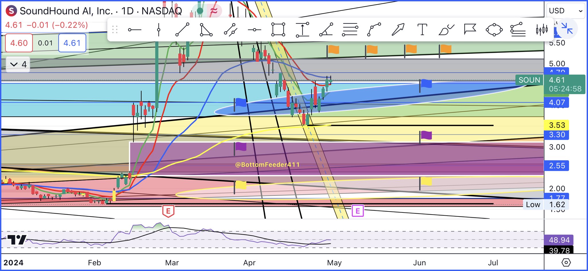 1,2,3,4 of 4 SOUN $SoundHound AI Inc(SOUN)$ Thoughts and possibilities. IMO could head up towards orange flags and into the green channel getting us out of the grey channel area we are at now. If grey channel/orange flag area fails, I believe we drop below blue flag area and head towards the purple channel/flag area for that gap shown on the daily chart and possibly that yellow flag area and then turn for the upside. We shall see how time plays out. Safe trading everyone.
