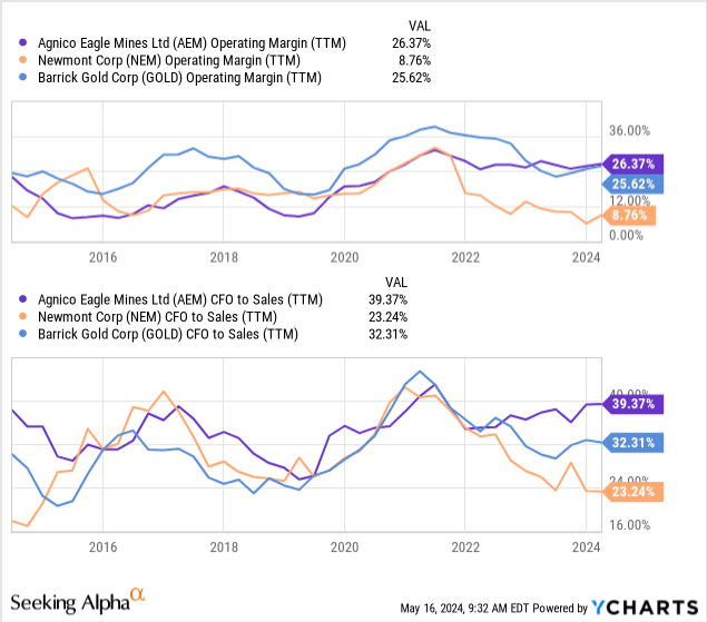 Historically, because AEM is more focused on developed markets, particularly Quebec and Ontario, it has had lower margins due to higher labor costs. However, the opposite is true today, as its more centralized footprint and a more economically stable area have made its margins more stable and higher. In general, it is reasonable to expect this trend to continue, with AEM likely benefiting more than its peers from higher gold prices.