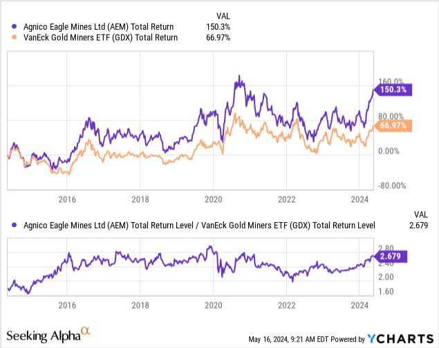 Agnico is on a very strong relative performance trend compared to the industry. It underperformed the gold mining index from 2020 to 2022 but has recovered since then, marking far superior returns as it has managed to keep its production costs from rising as quickly as its peers.