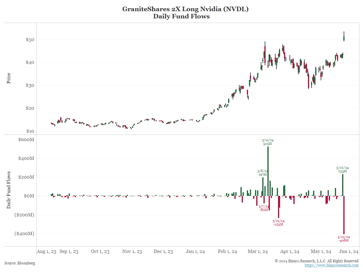 On Wednesday, May 22, $233 million flowed into NVDL (the 2x ETF of NVDA). After the close, NVDA (the stock) reported blowout earnings