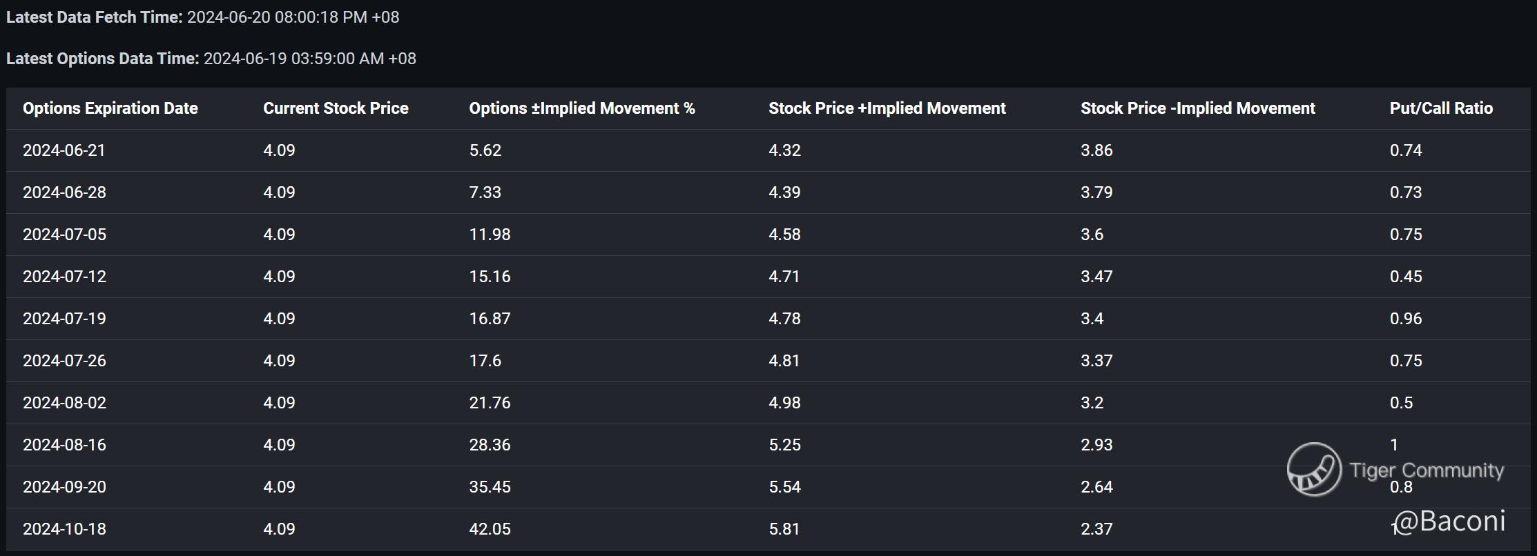$SoundHound AI Inc(SOUN)$ has been capturing the spotlight in the AI sector with its innovative voice and speech recognition technologies. As the options expiration date of June 21, 2024, approaches, market watchers keenly observe the stock, which trades at $4.09. With an implied movement of ±5.62%, the stock price could rise to $4.32 or fall to $3.86. The put/call ratio is 0.74, indicating a bullish sentiment among investors.
