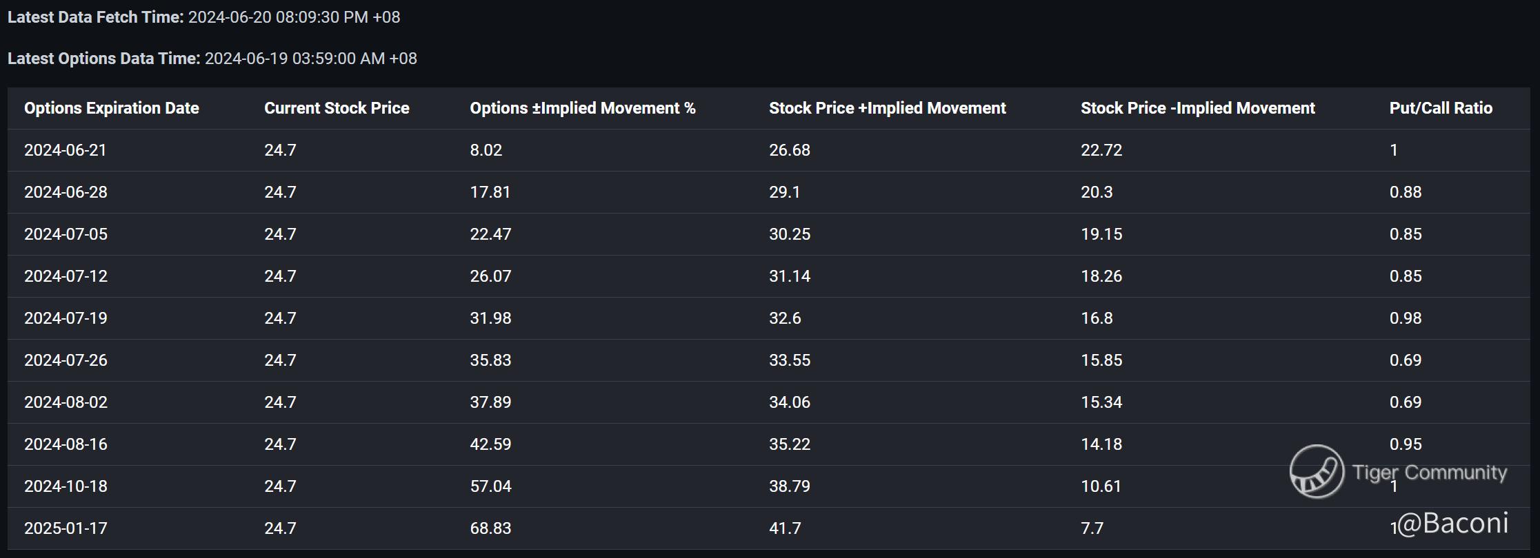 $GameStop(GME)$ remains a focal point for investors and market analysts as we approach the expiry of June 21, 2024 options. The current stock price is $24.70, and the options data indicates an implied movement of ±8.02%. This projection suggests potential price fluctuations between $22.72 and $26.68. Notably, the put/call ratio stands at 1, indicating a balanced sentiment among investors regarding the stock's future direction.
